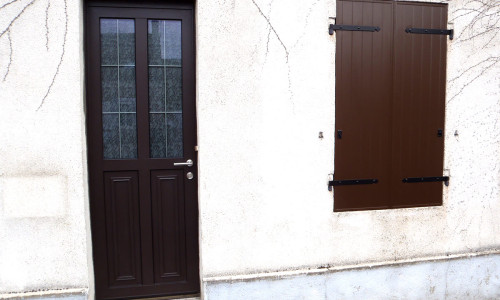 Remplacement d'une porte d'entrée et de volets en bois par des menuiseries en aluminum de couleurs sans entretien.
