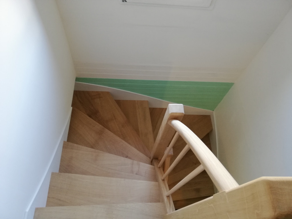 Escalier 2 quarts tournants sur mesure, accès au 2ème étage avec départ type à l'anglaise.